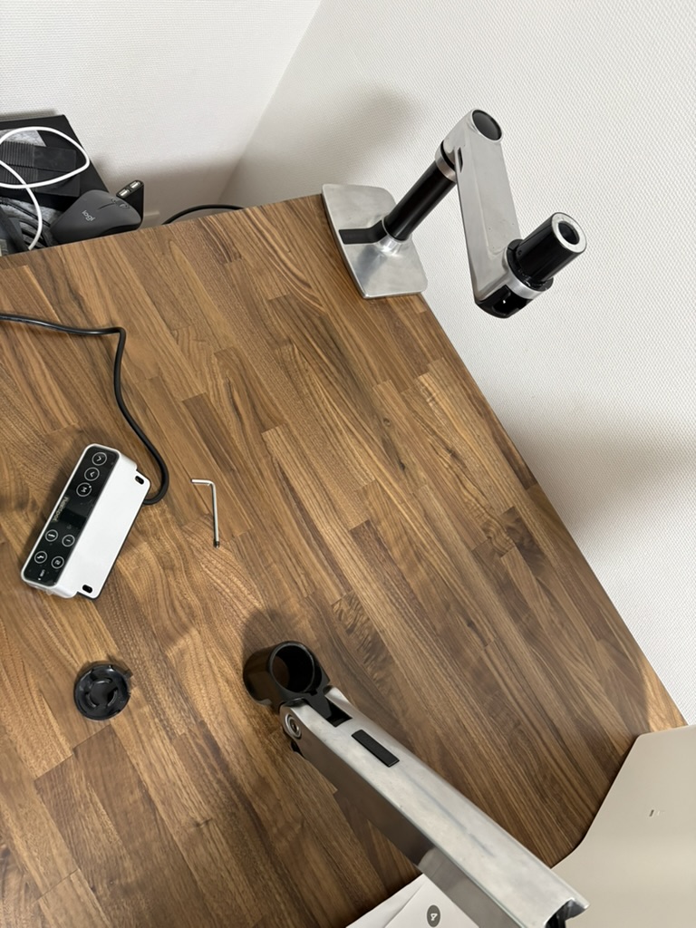 合板ですが継ぎ目は気になりません。表面はすべすべしていて、手で触っていたくなる仕上がりでした。面取りもちょうどよくて、腕を置いても角が当たらないけど丸すぎない。前のダイニングテーブルは角がかなり丸くて、クランプ式のモニターアームがギリギリでした。PREDUCTSはそのへんちゃんとしていて、クランプがしっかり噛みます。